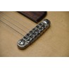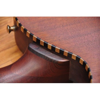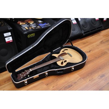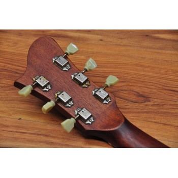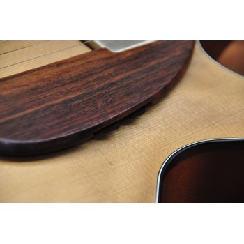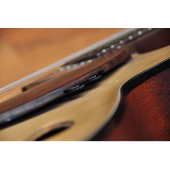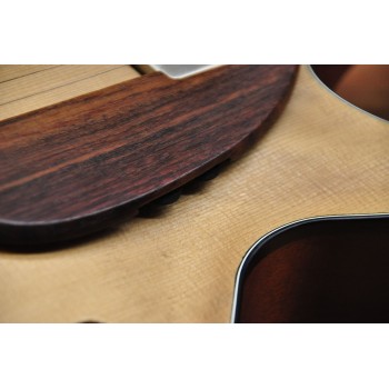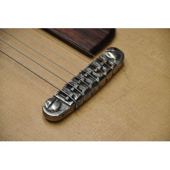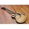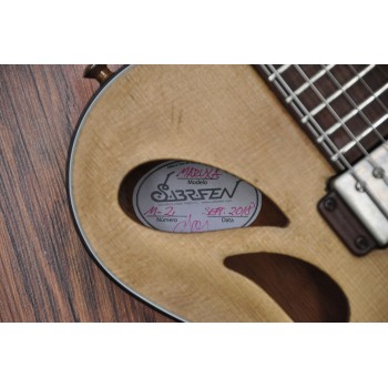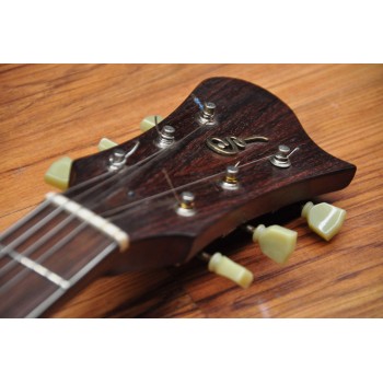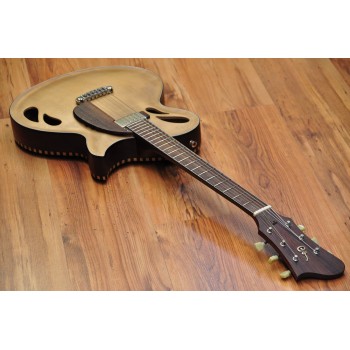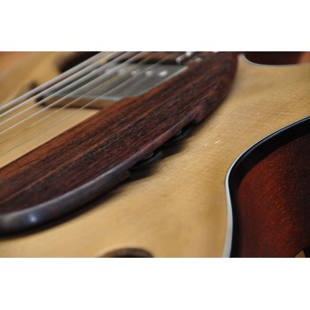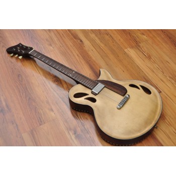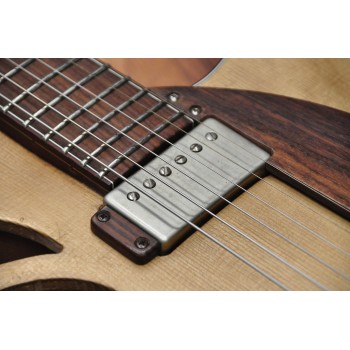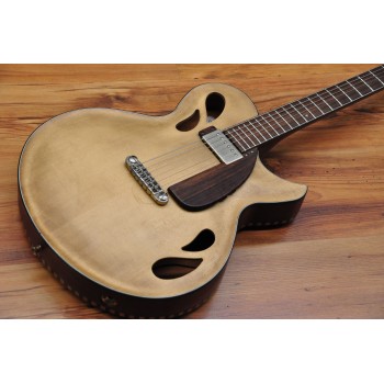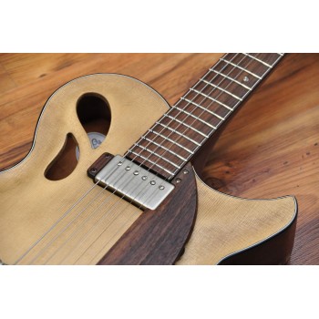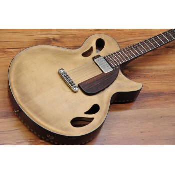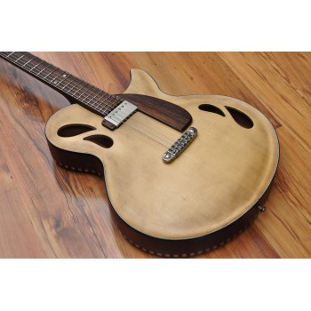 Mástil de caoba, perfil trasero ligeramente asimétrico. Sobretapa y diapasón de palosanto de la India. Escala 25″ Radio compuesto 10” a 14″ Trastes Jumbo. Cuerpo: Aros de caoba macizos. Tapa de abeto europeo, tallado a mano. Fondo de caoba tallado a mano. 38,5 cm de óvalo inferior lo que equivale a la talla 15″ en guitarras archtop. Pastilla Tokaa humbucker tipo PAF. Clavijas Schaller. Puente ABM wraparound. Controles ocultos de tono y volumen bajo golpeador de palosanto India. Acabado al aceite y relic ligero